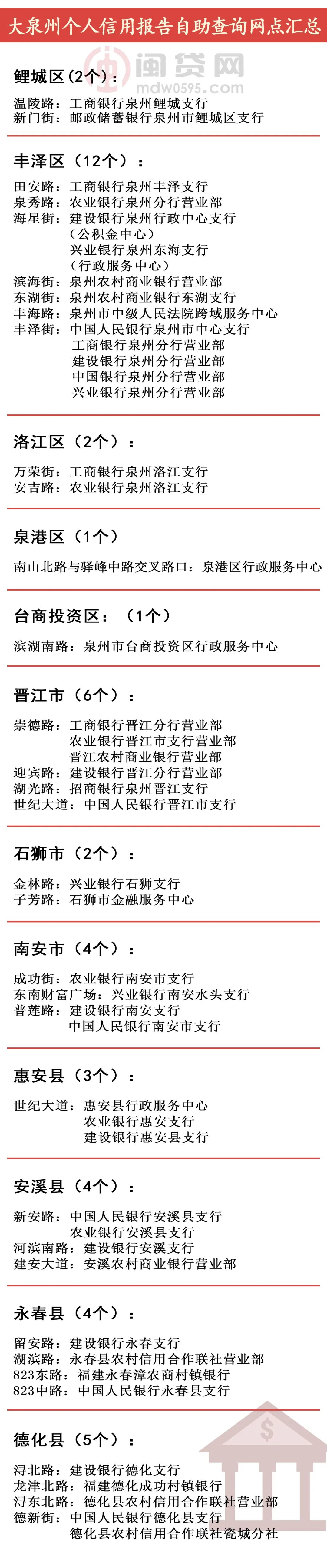 大泉州为切实提高征信查询便捷度,更好地向社会公众提供安全、高效的个人信用报告查询服务,目前为此开放了46个个人信用报告自助查询网点。只需持中华人民共和国第二代居民身份证前往自助查询服务点,便可查询本人信用报告!